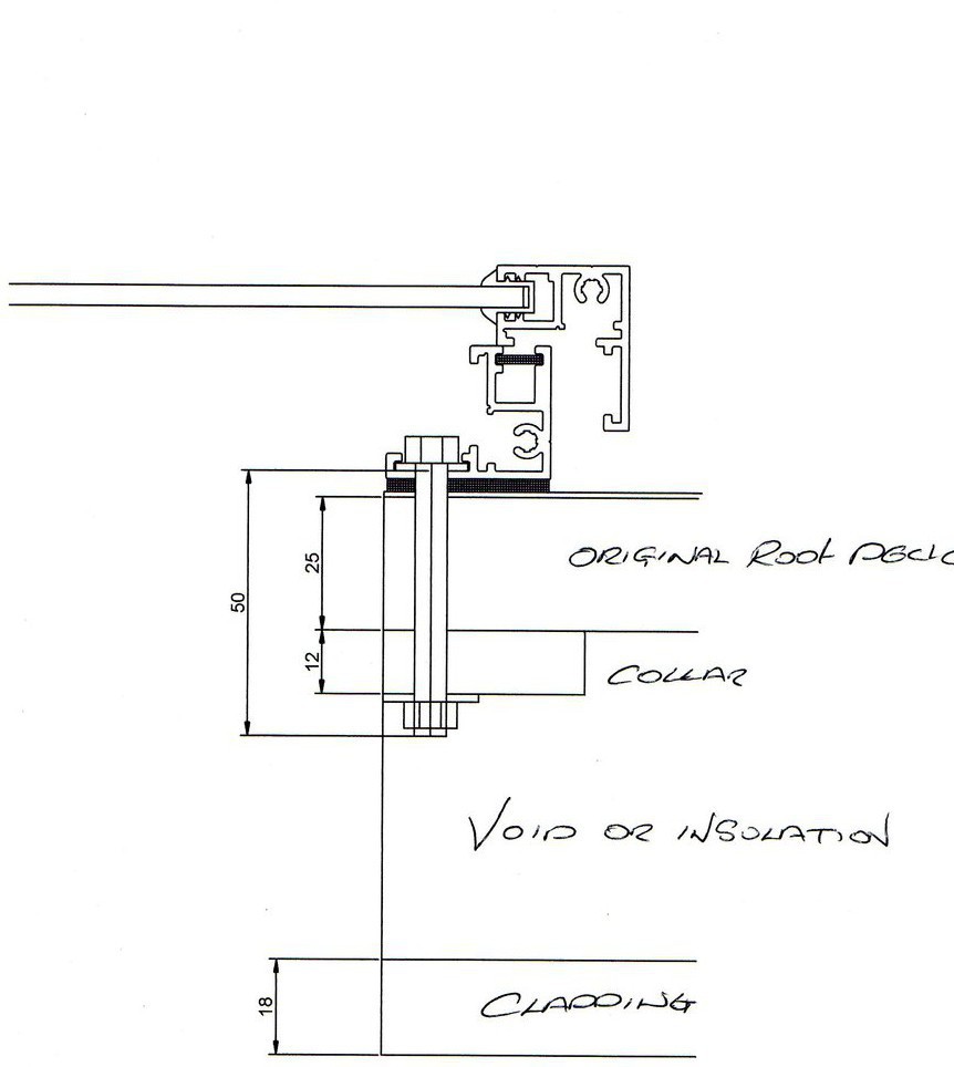 The Same is true when fitting to and externally Insulated roof, by cutting through the internal Deck and then the insulation and Ply wood on top of that, access can be gained to the insulation which needs to be "dug out" removed to a depth of 50mm all round, this is extremly messy, but as it will never be seen after final cladding this does not have to be neat.